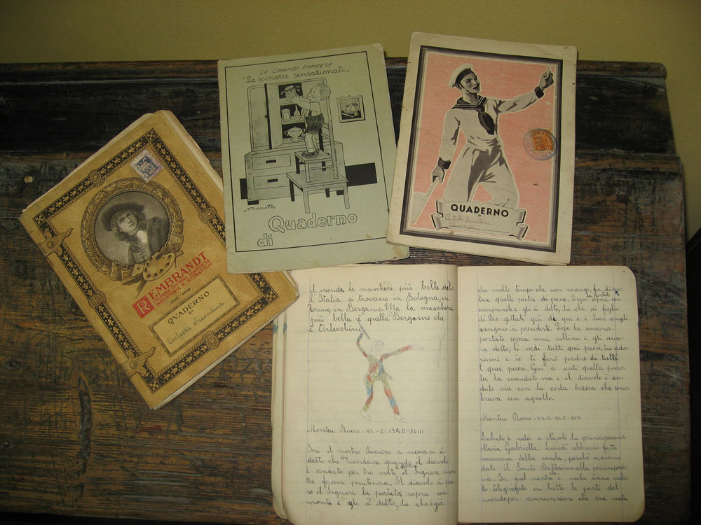 Raccolti su un banco anni ’50: una cartella maschile, un quaderno degli anni ’30 e un compasso del 1920. (Foto da “C’era una volta…la scuola”, mostra allestita dalla scuola primaria di Monteu Roero, maggio 2011).